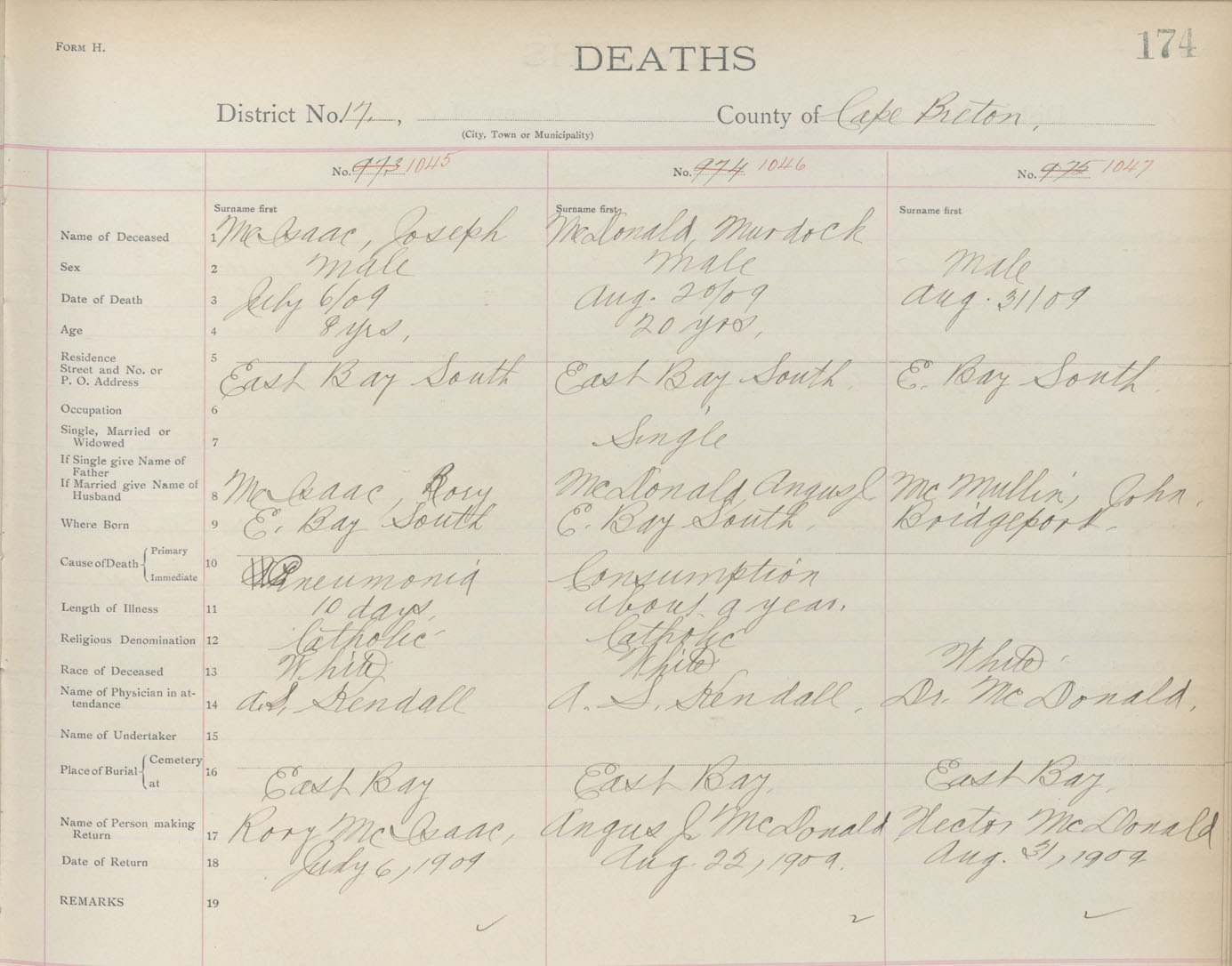 Male Death Registration: Year: 1909 book: 3 page: 174 number: 1047
