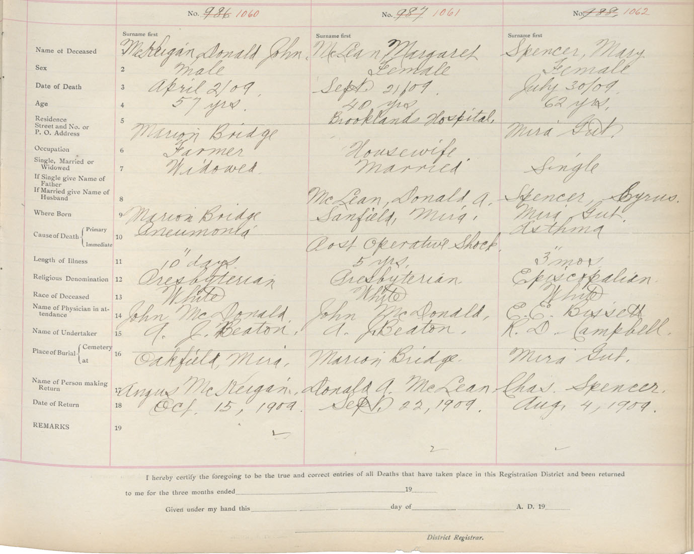 Death Registration: Year: 1909 book: 3 page: 176 number: 1060