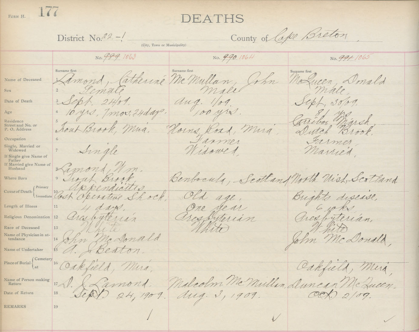 Death Registration: Year: 1909 book: 3 page: 177 number: 1063