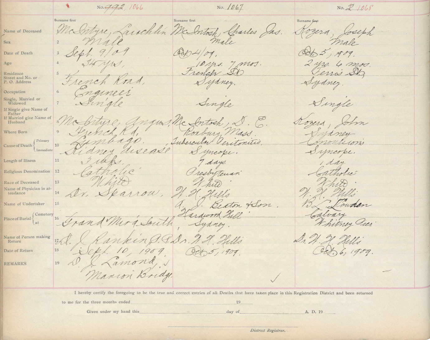 Death Registration: Year: 1909 book: 3 page: 177 number: 1066