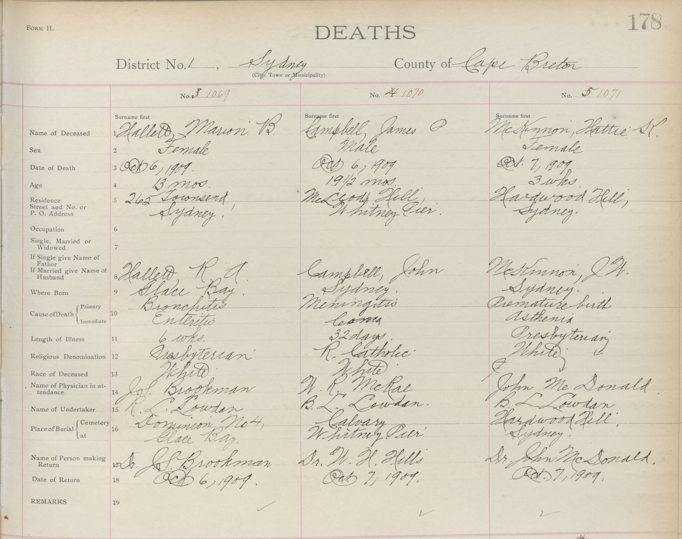 Death Registration: Year: 1909 book: 3 page: 178 number: 1069