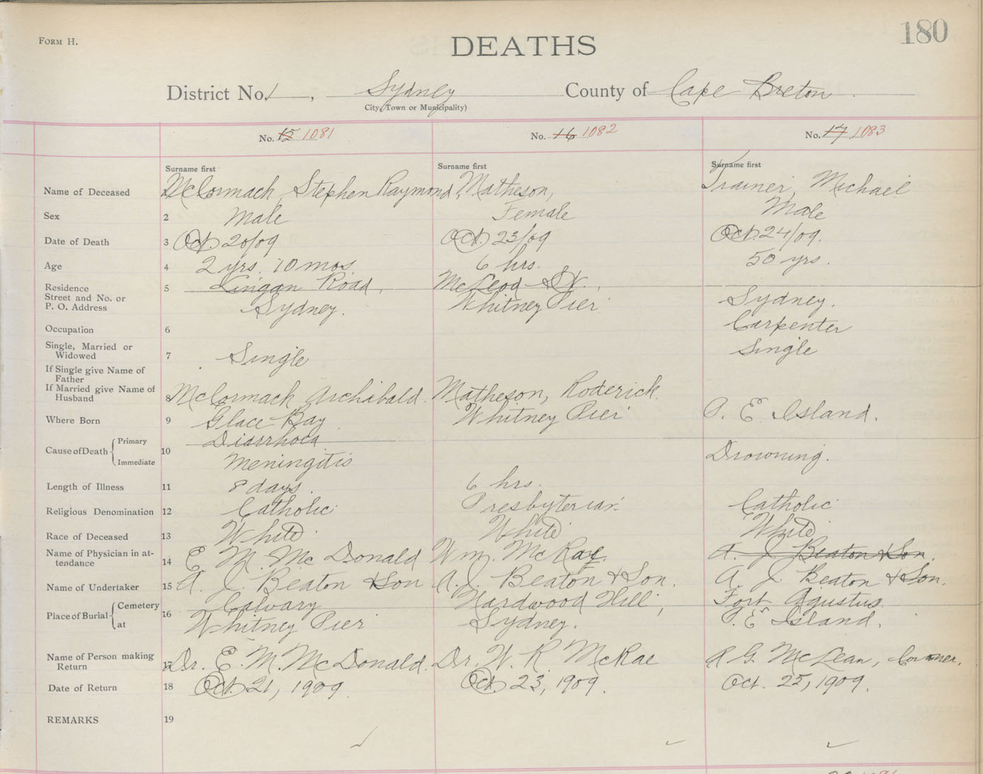 Death Registration: Year: 1909 book: 3 page: 180 number: 1081