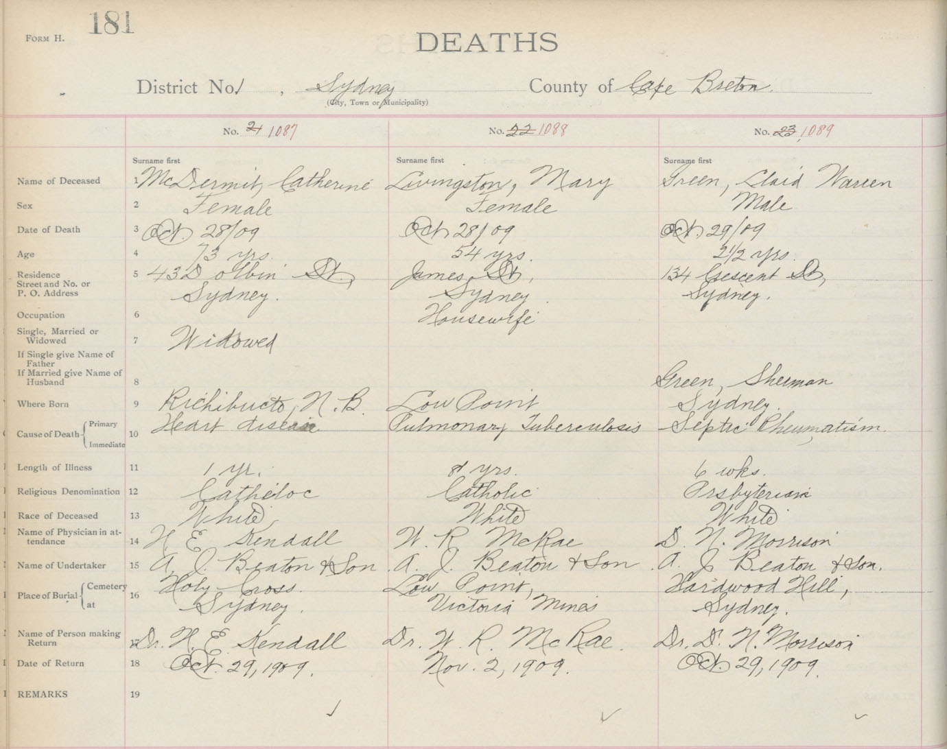 Death Registration: Year: 1909 book: 3 page: 181 number: 1089