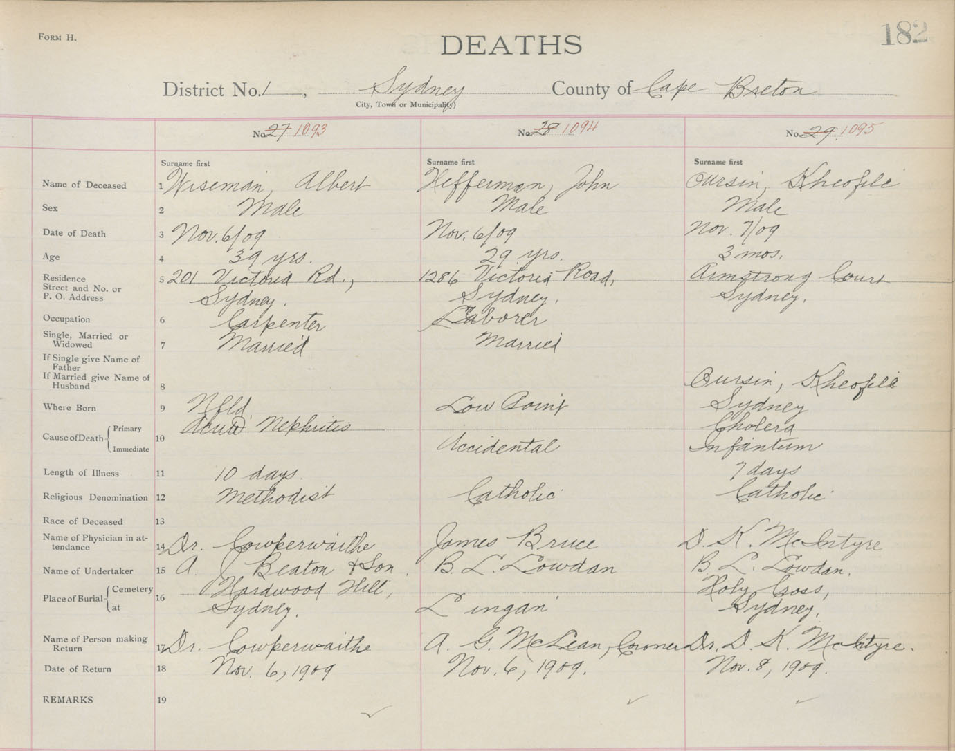 Death Registration: Year: 1909 book: 3 page: 182 number: 1095