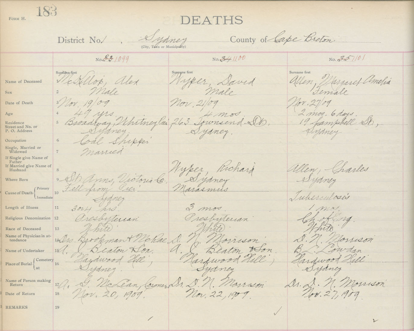 Death Registration: Year: 1909 book: 3 page: 183 number: 1101