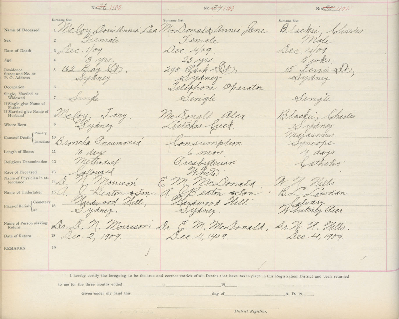 Death Registration: Year: 1909 book: 3 page: 183 number: 1104