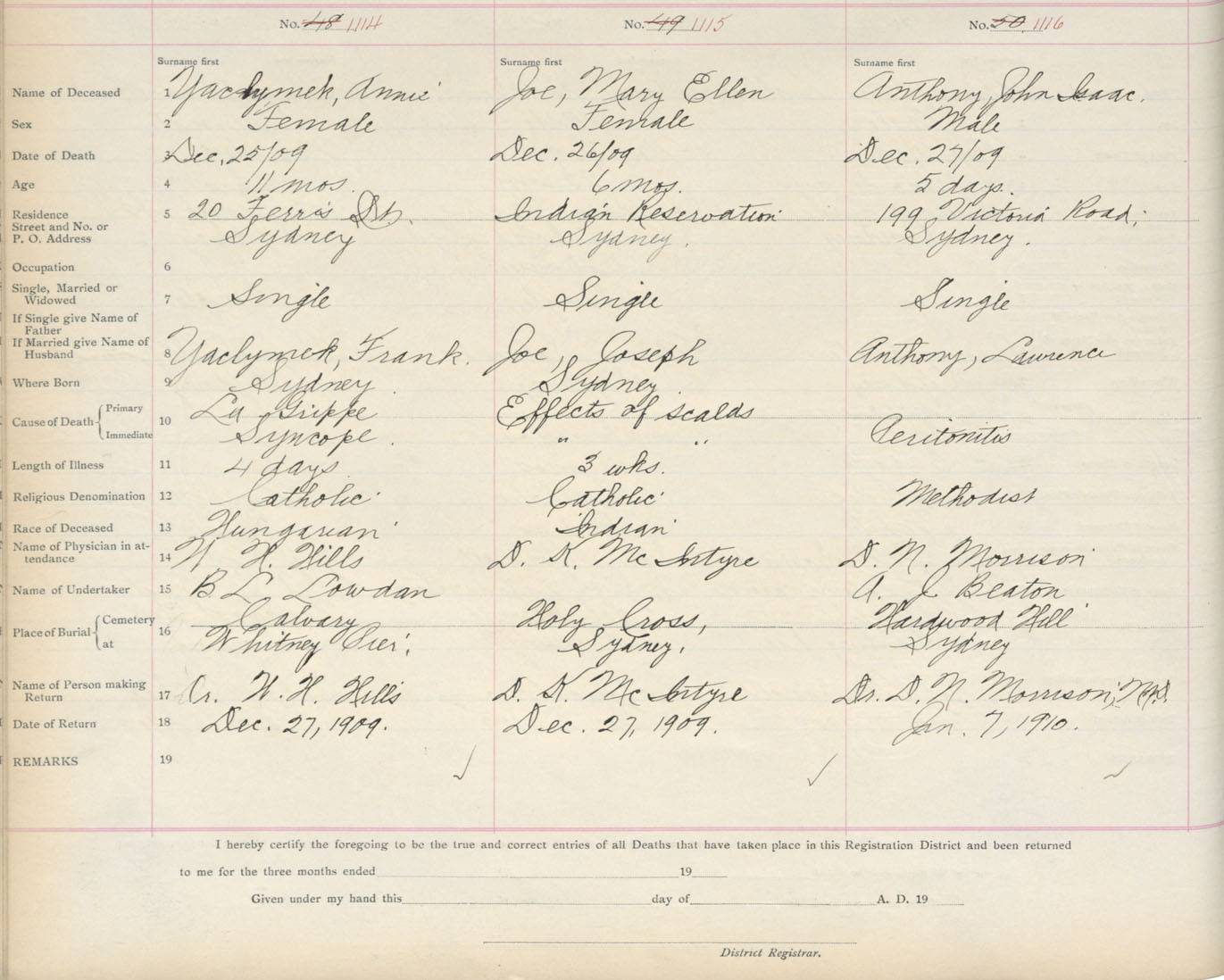 Death Registration: Year: 1909 book: 3 page: 185 number: 1114