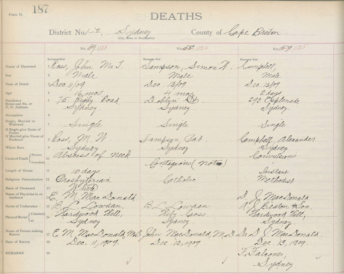 Death Registration: Year: 1909 book: 3 page: 187 number: 1123