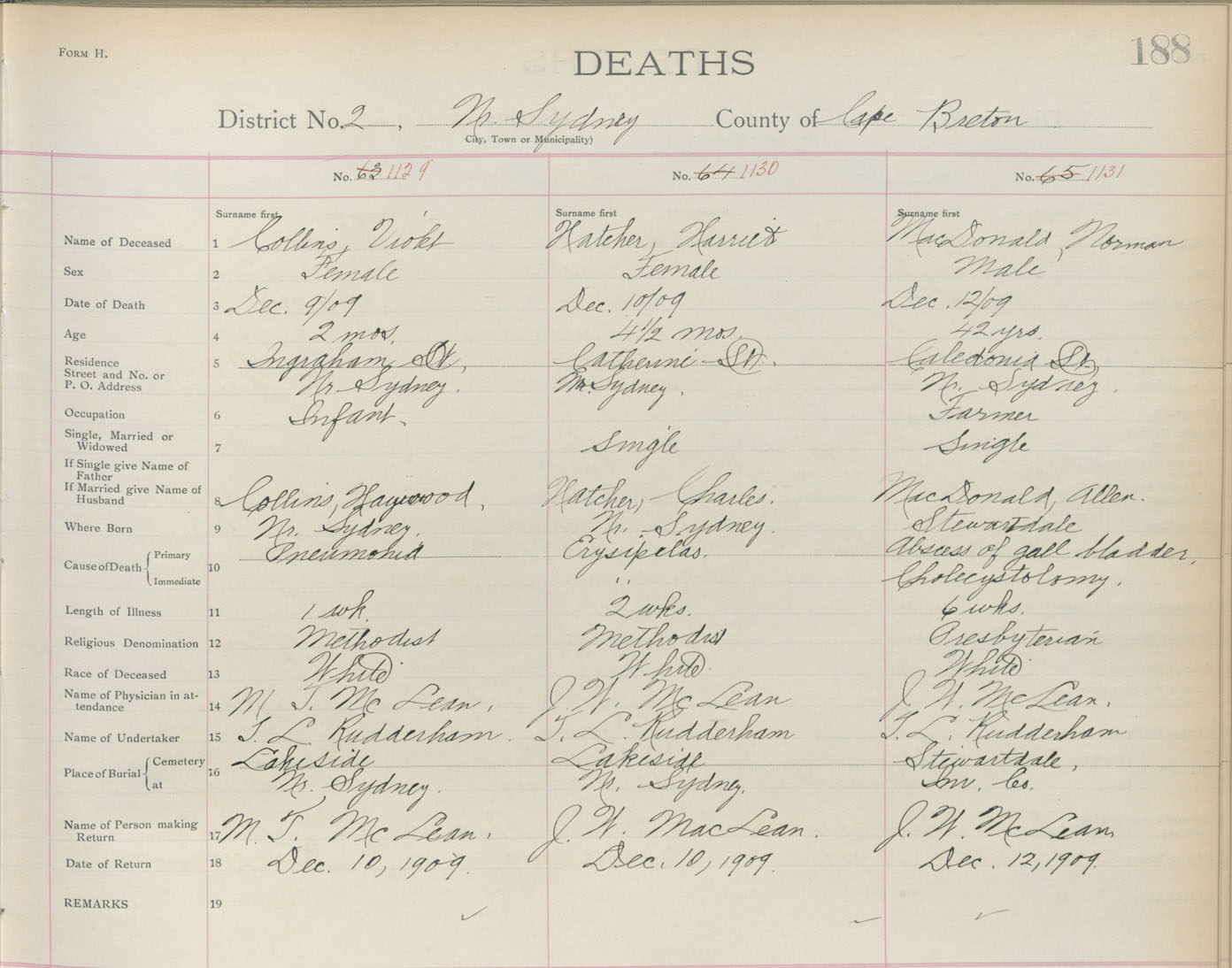Death Registration: Year: 1909 book: 3 page: 188 number: 1129