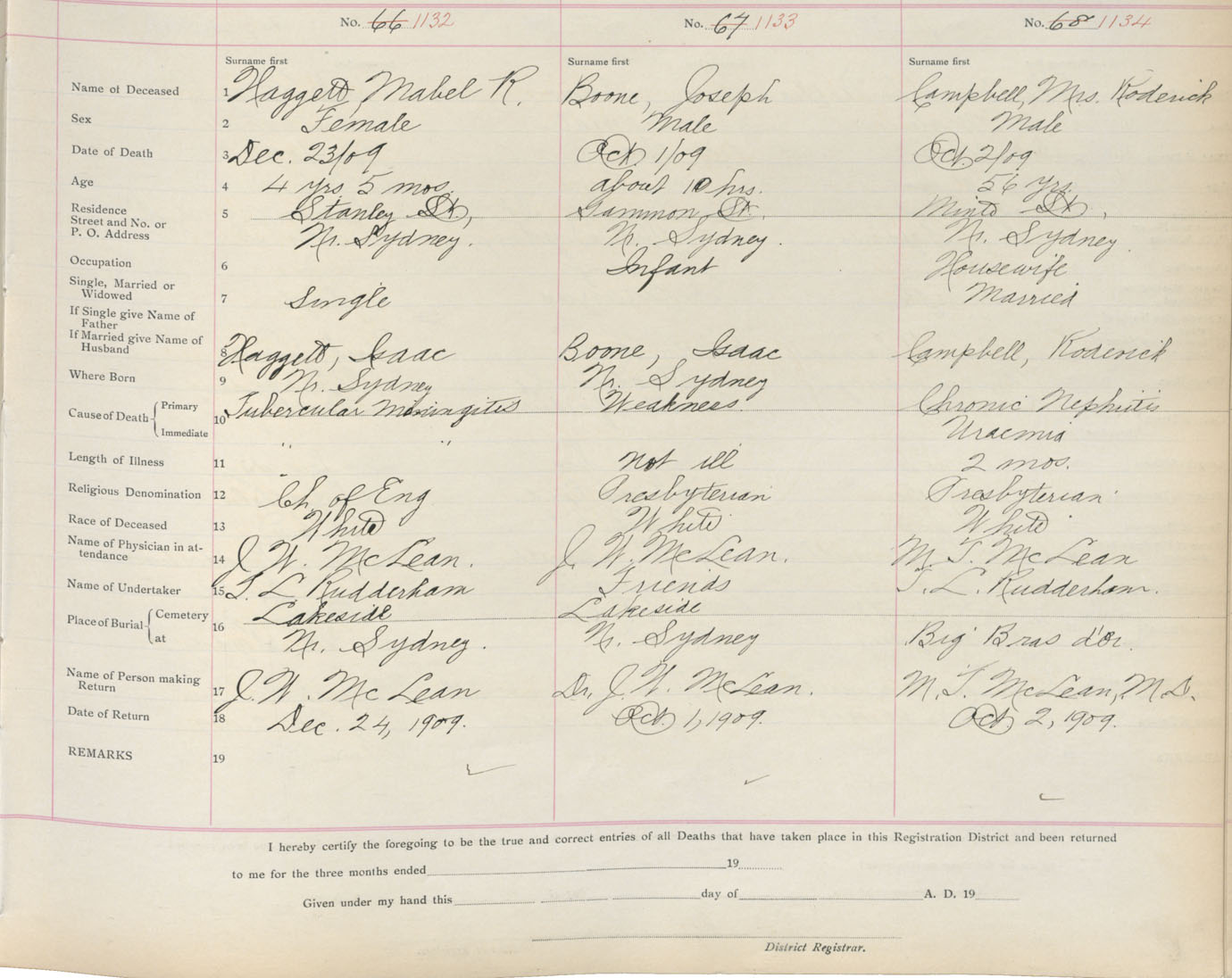 Death Registration: Year: 1909 book: 3 page: 188 number: 1132