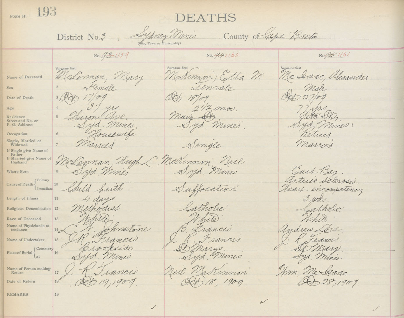 Death Registration: Year: 1909 book: 3 page: 193 number: 1159