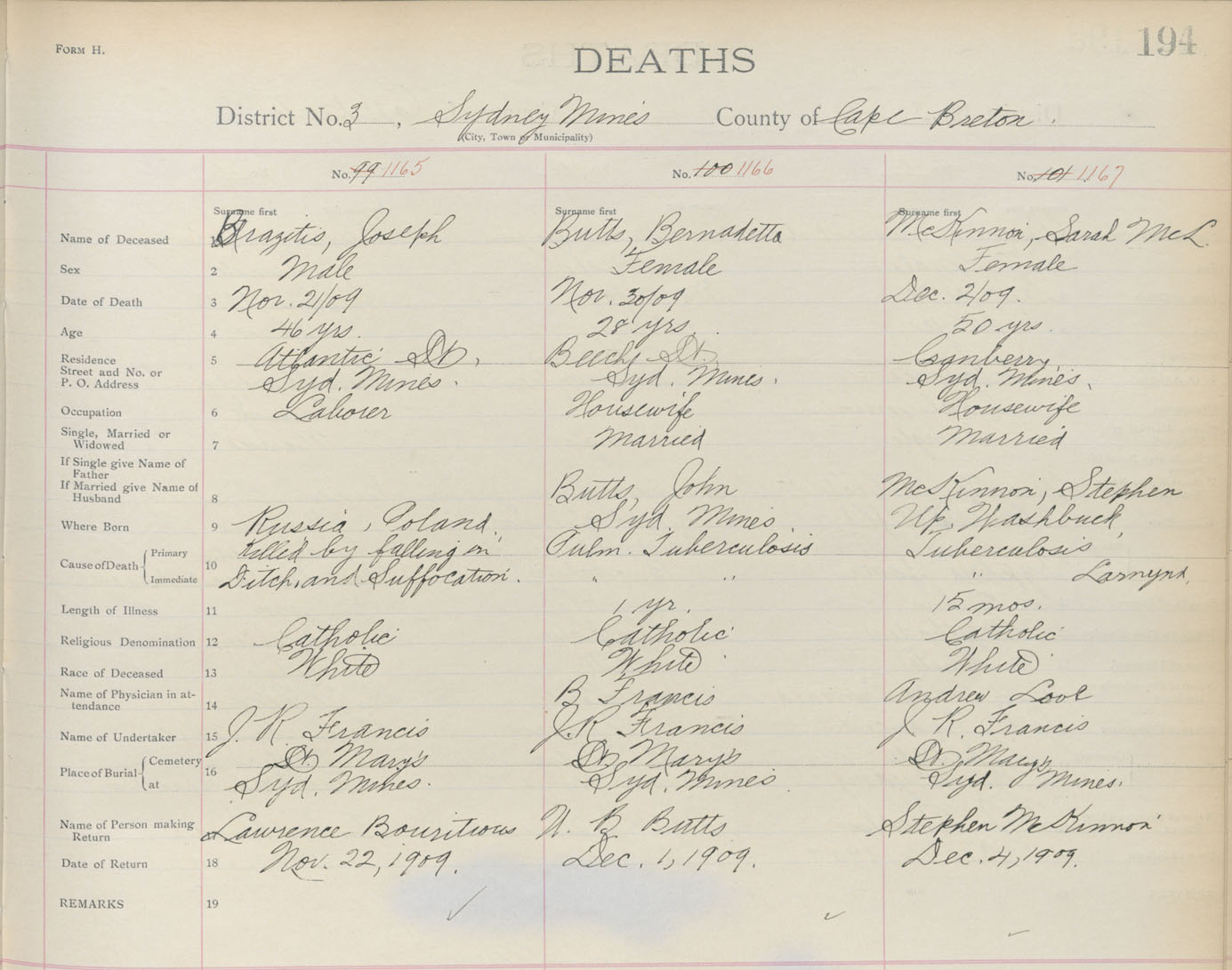 Death Registration: Year: 1909 book: 3 page: 194 number: 1165