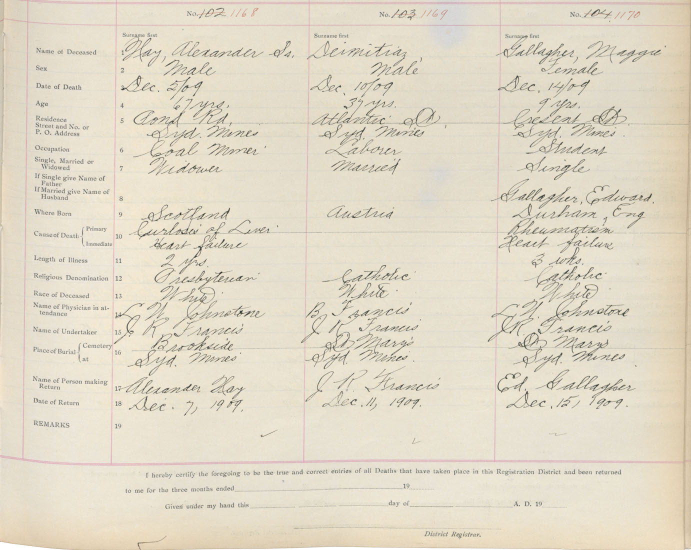 Death Registration: Year: 1909 book: 3 page: 194 number: 1168