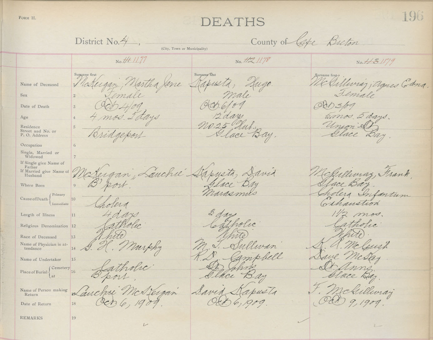 Death Registration: Year: 1909 book: 3 page: 196 number: 1177