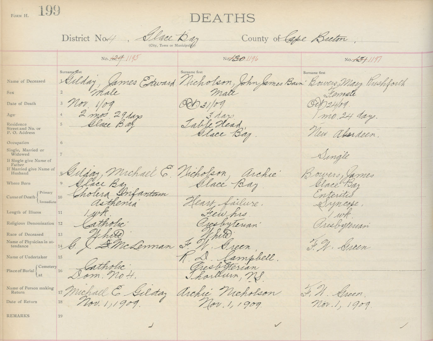 Death Registration: Year: 1909 book: 3 page: 199 number: 1197