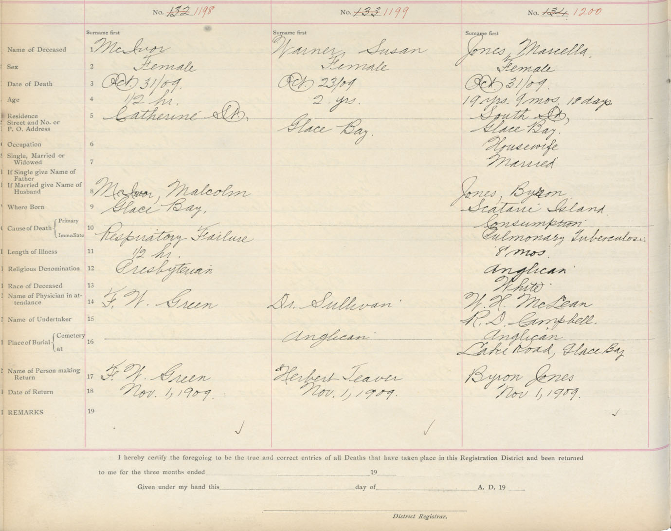 Death Registration: Year: 1909 book: 3 page: 199 number: 1200