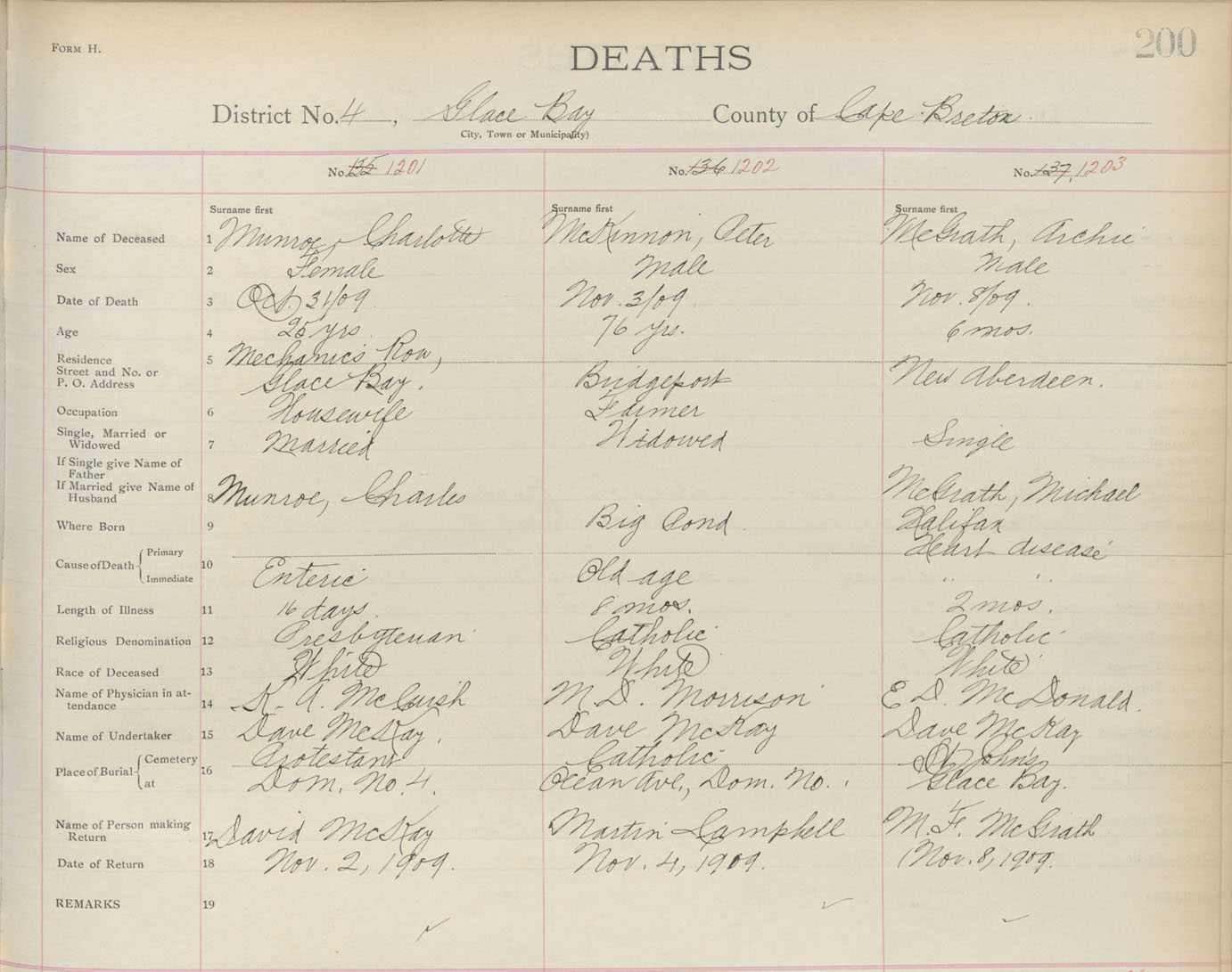 Death Registration: Year: 1909 book: 3 page: 200 number: 1203