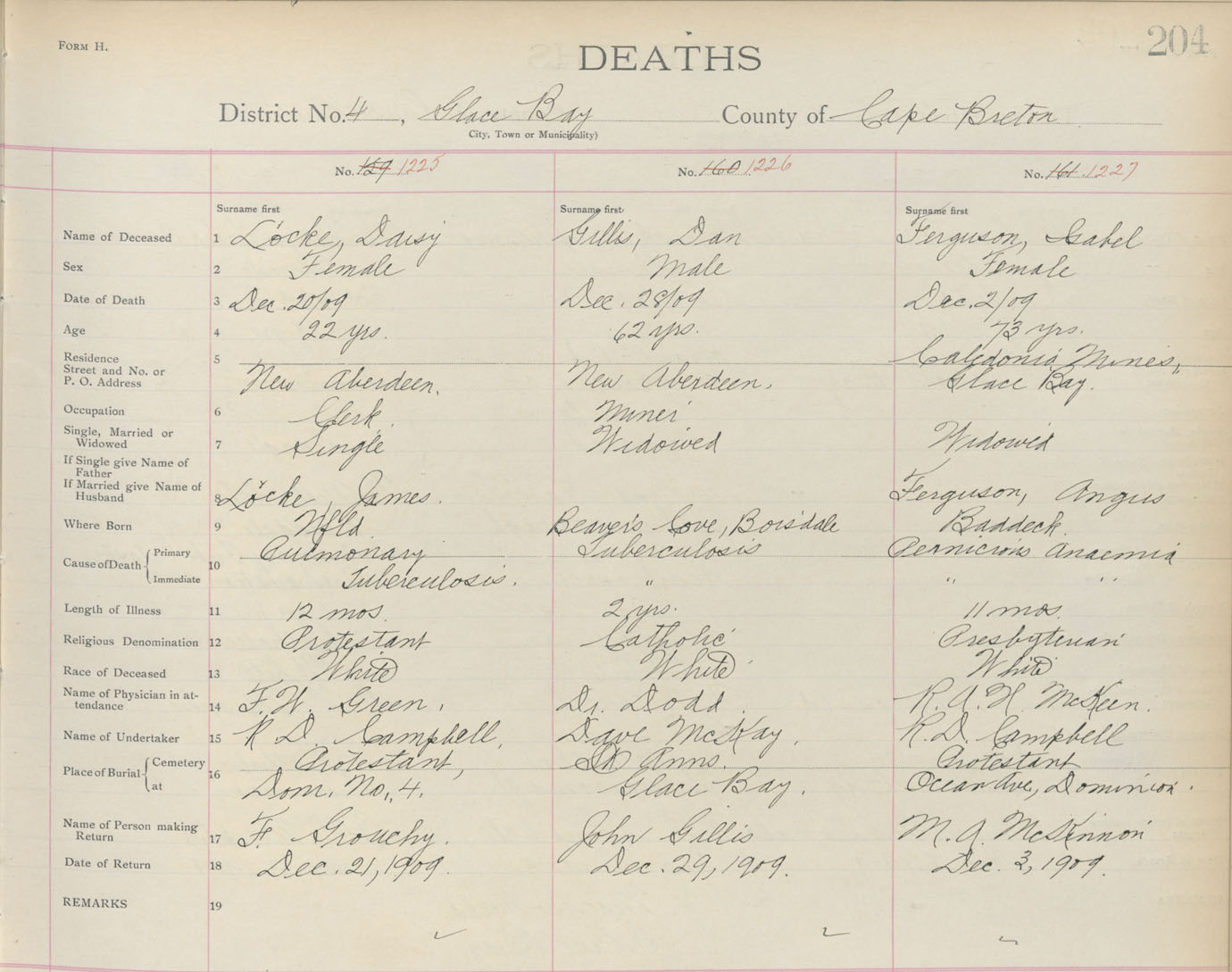 Death Registration: Year: 1909 book: 3 page: 204 number: 1227