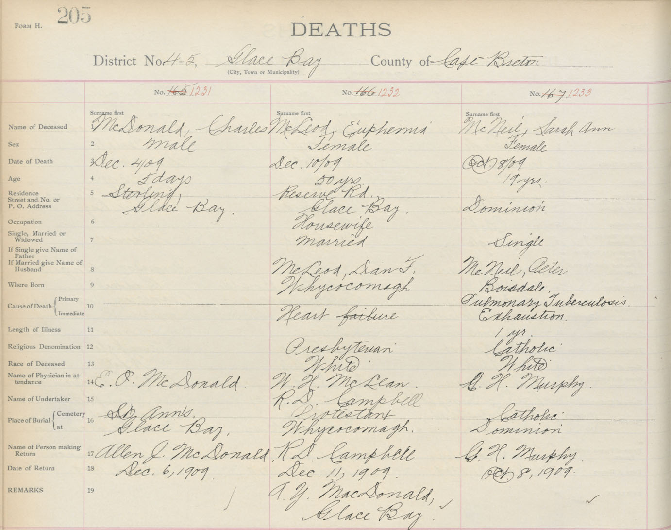 Death Registration: Year: 1909 book: 3 page: 205 number: 1231