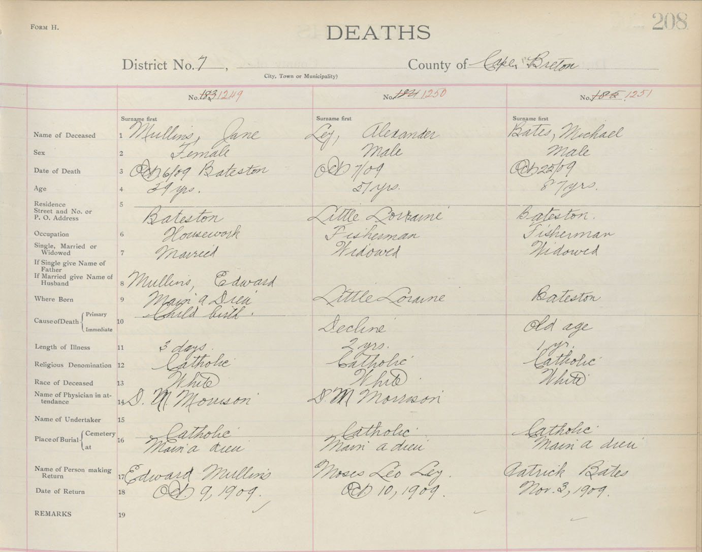 Death Registration: Year: 1909 book: 3 page: 208 number: 1251