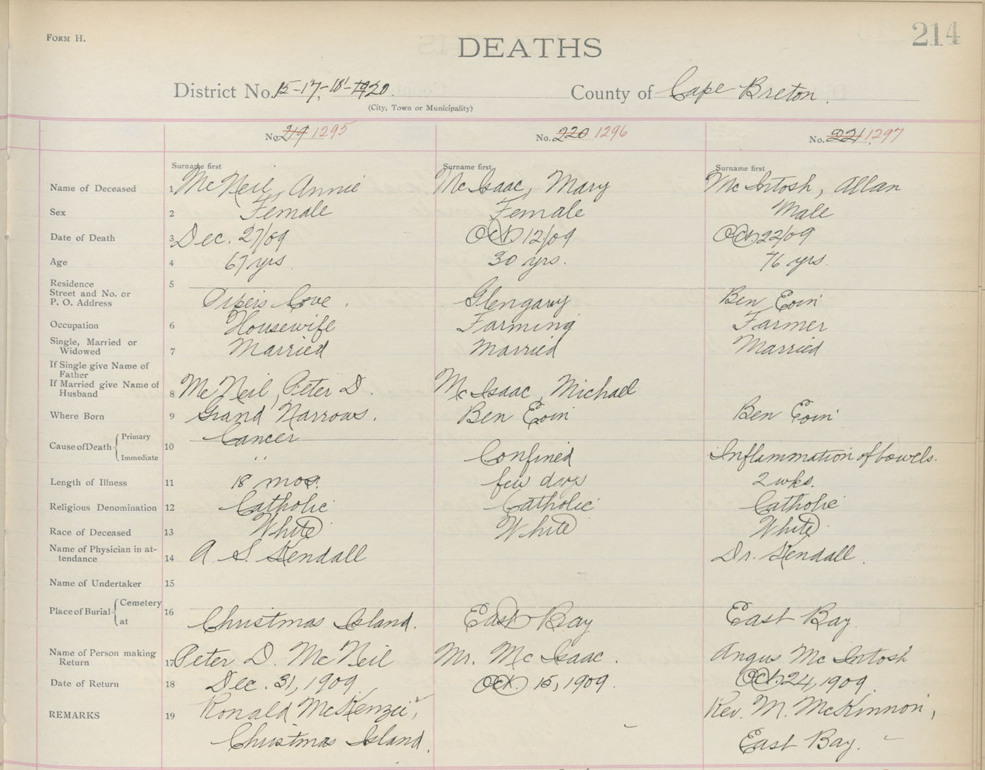Death Registration: Year: 1909 book: 3 page: 214 number: 1297