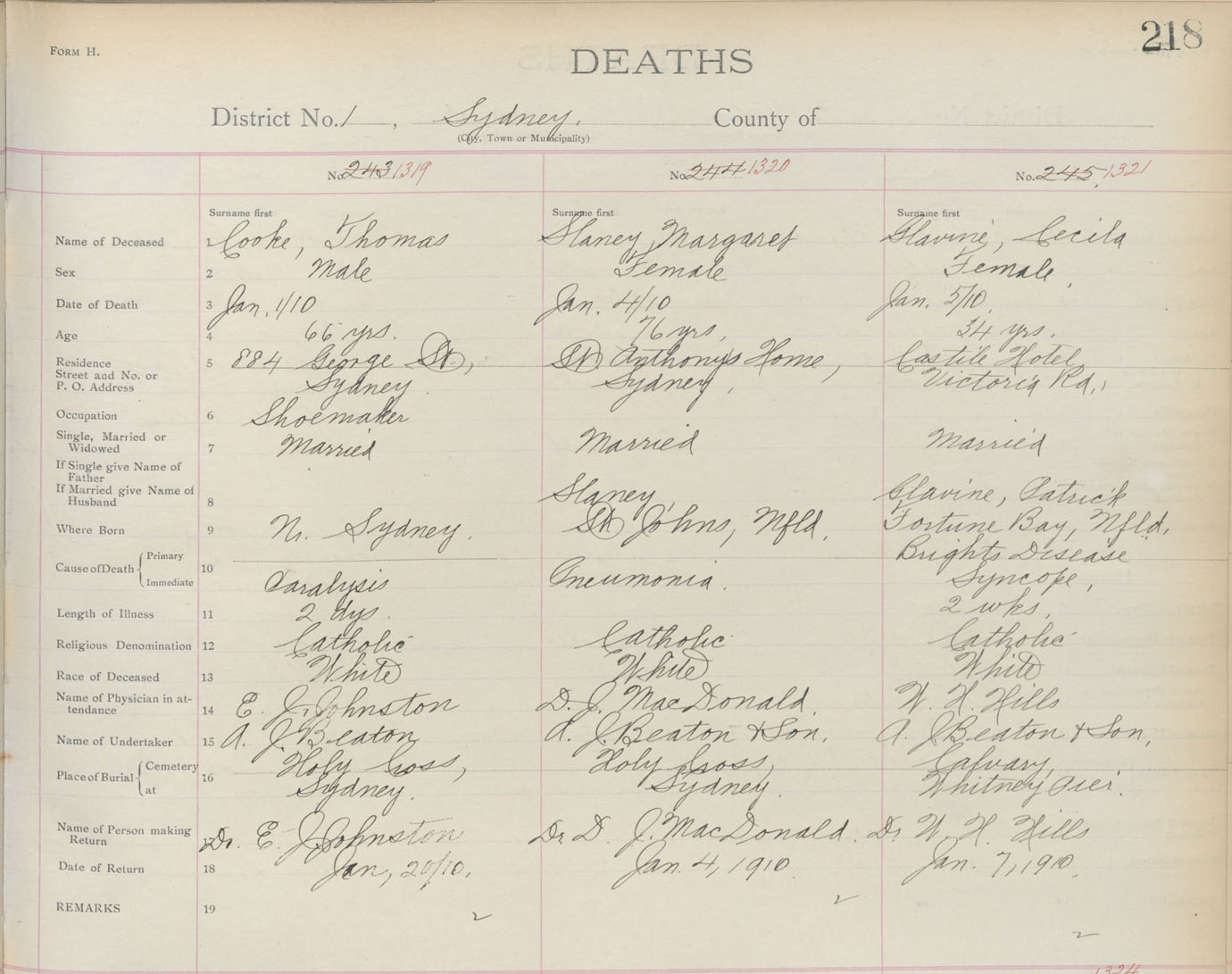 Death Registration: Year: 1910 book: 3 page: 218 number: 1321
