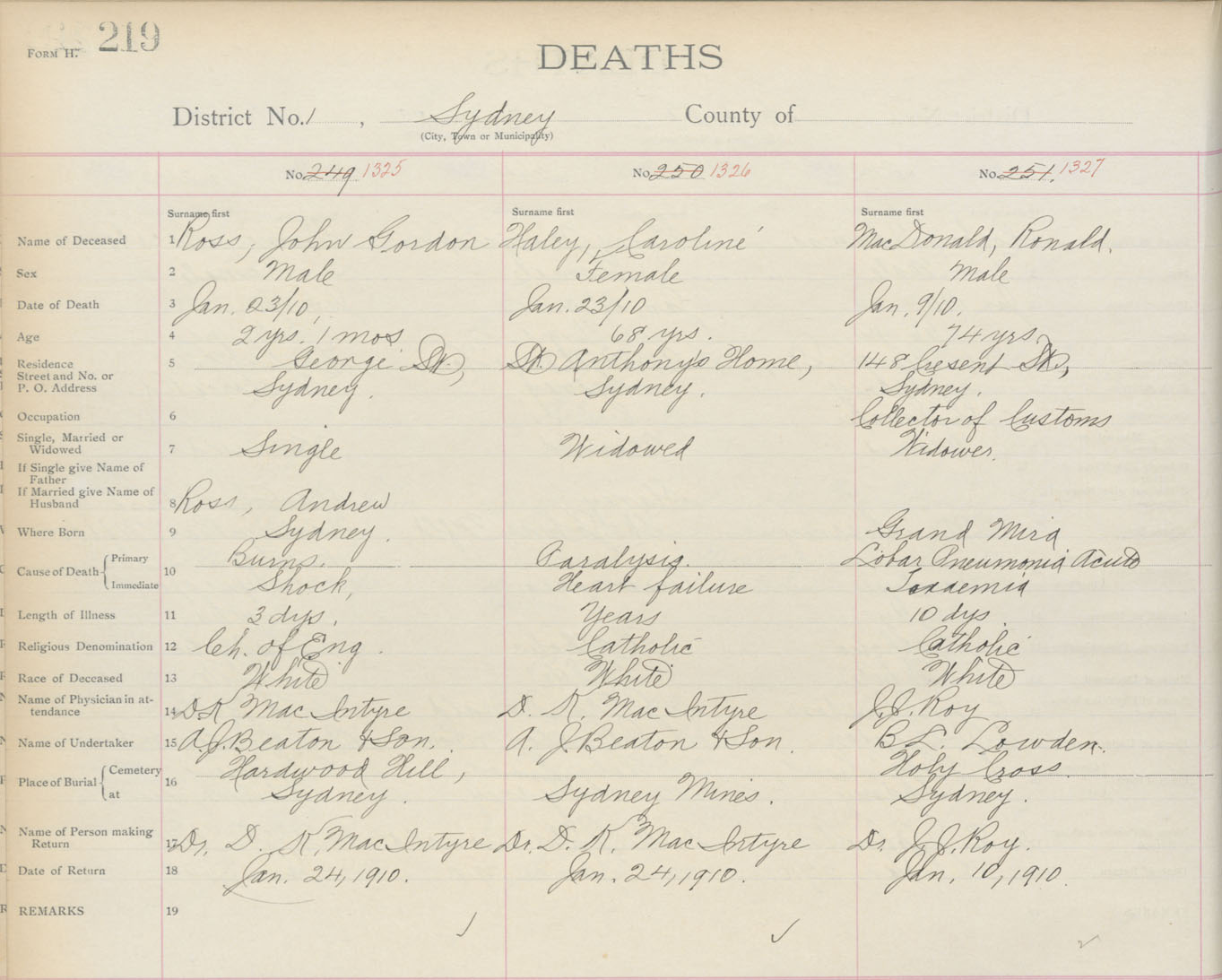 Death Registration: Year: 1910 book: 3 page: 219 number: 1327