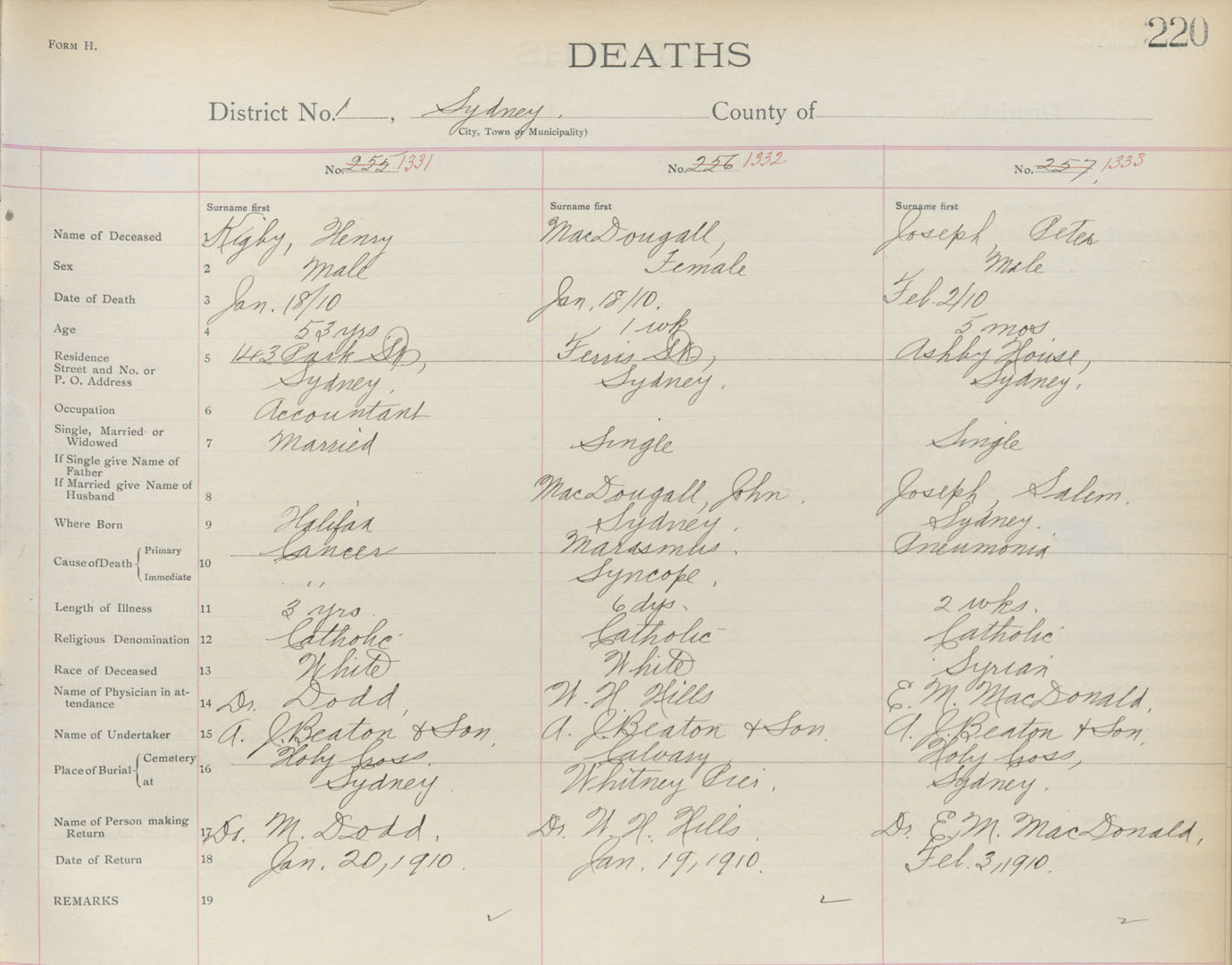 Death Registration: Year: 1910 book: 3 page: 220 number: 1331