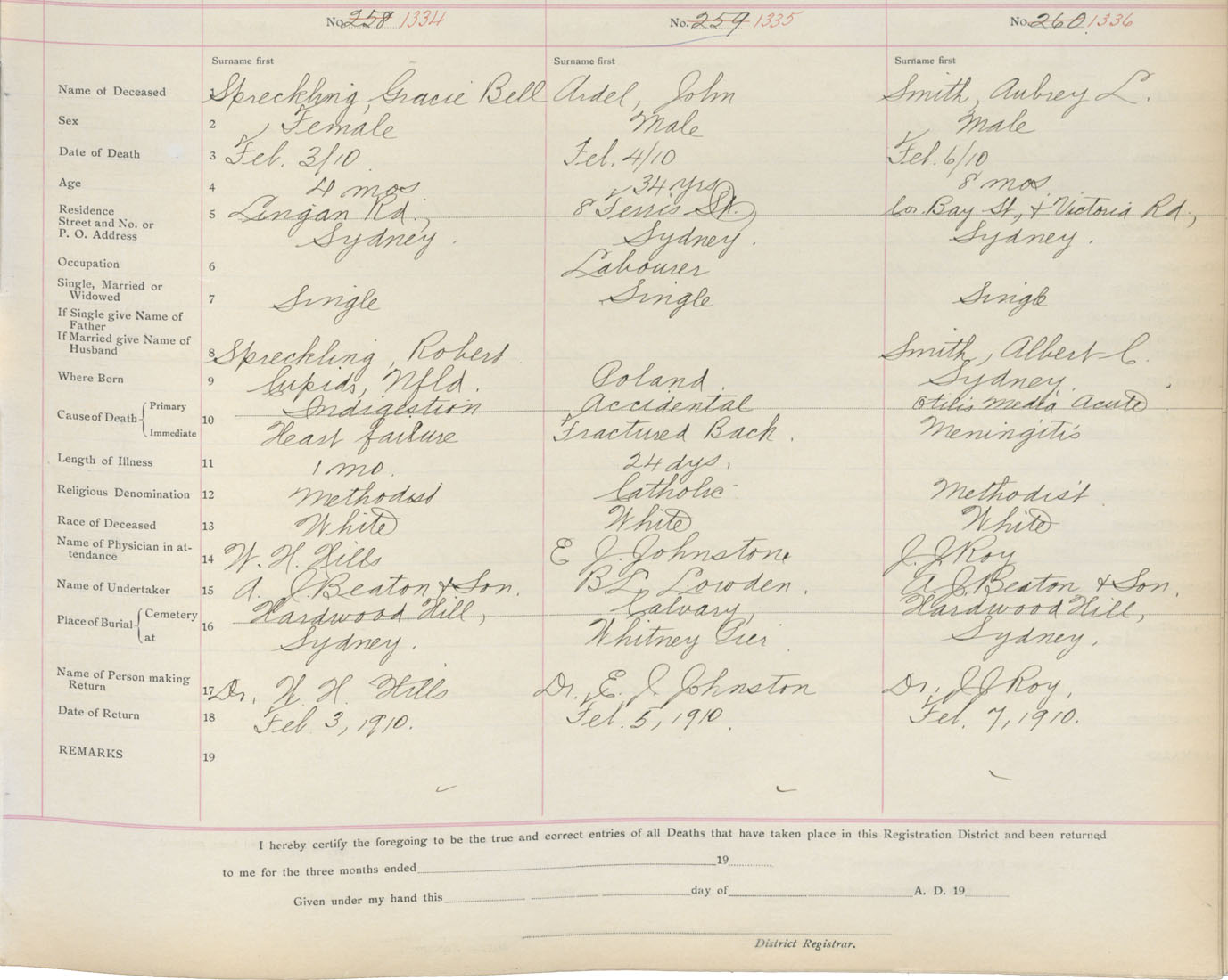 Death Registration: Year: 1910 book: 3 page: 220 number: 1334