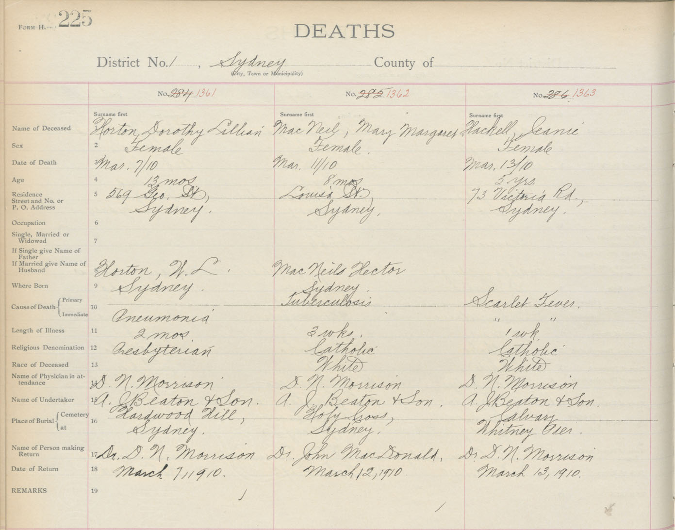 Death Registration: Year: 1910 book: 3 page: 225 number: 1363