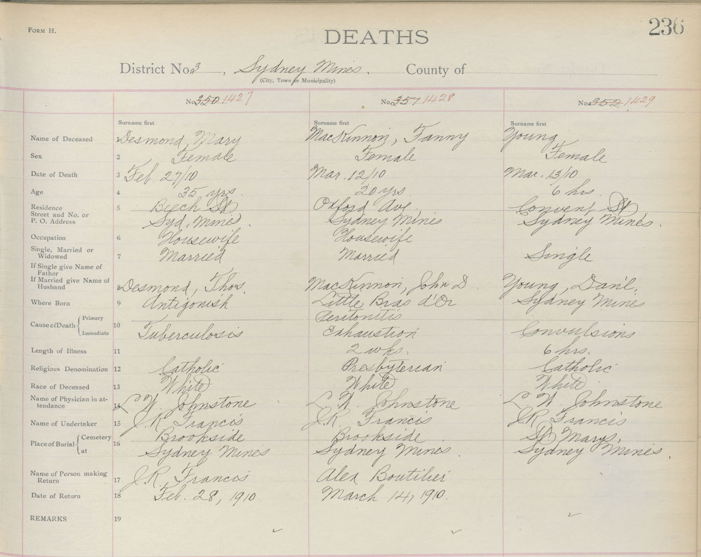 Female Death Registration: Year: 1910 book: 3 page: 236 number: 1429