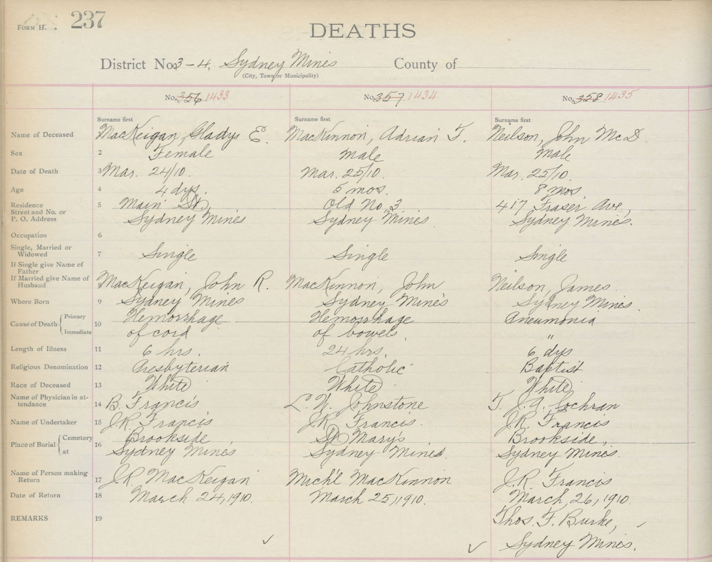 Death Registration: Year: 1910 book: 3 page: 237 number: 1433