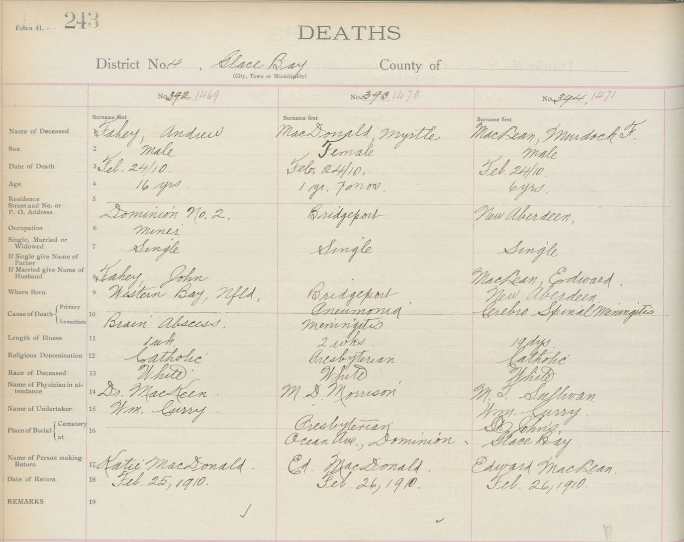 Death Registration: Year: 1910 book: 3 page: 243 number: 1470