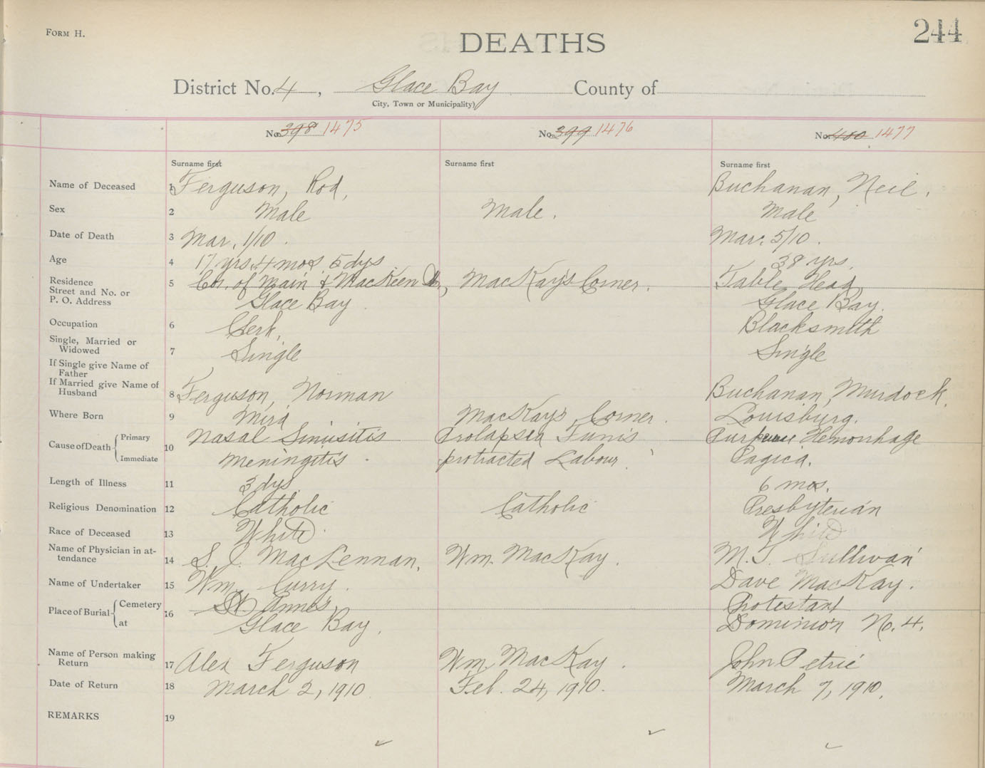 Death Registration: Year: 1910 book: 3 page: 244 number: 1477