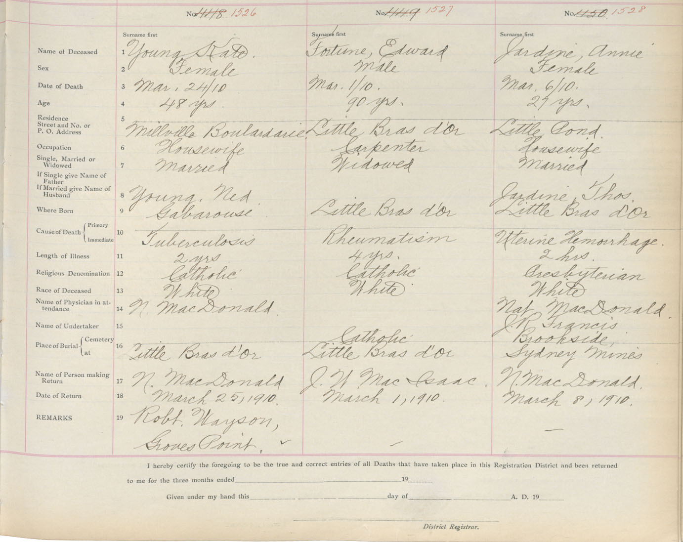 Death Registration: Year: 1910 book: 3 page: 252 number: 1526