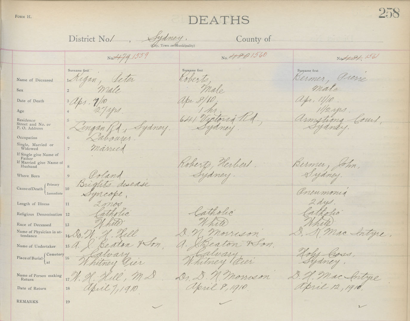 Death Registration: Year: 1910 book: 3 page: 258 number: 1559