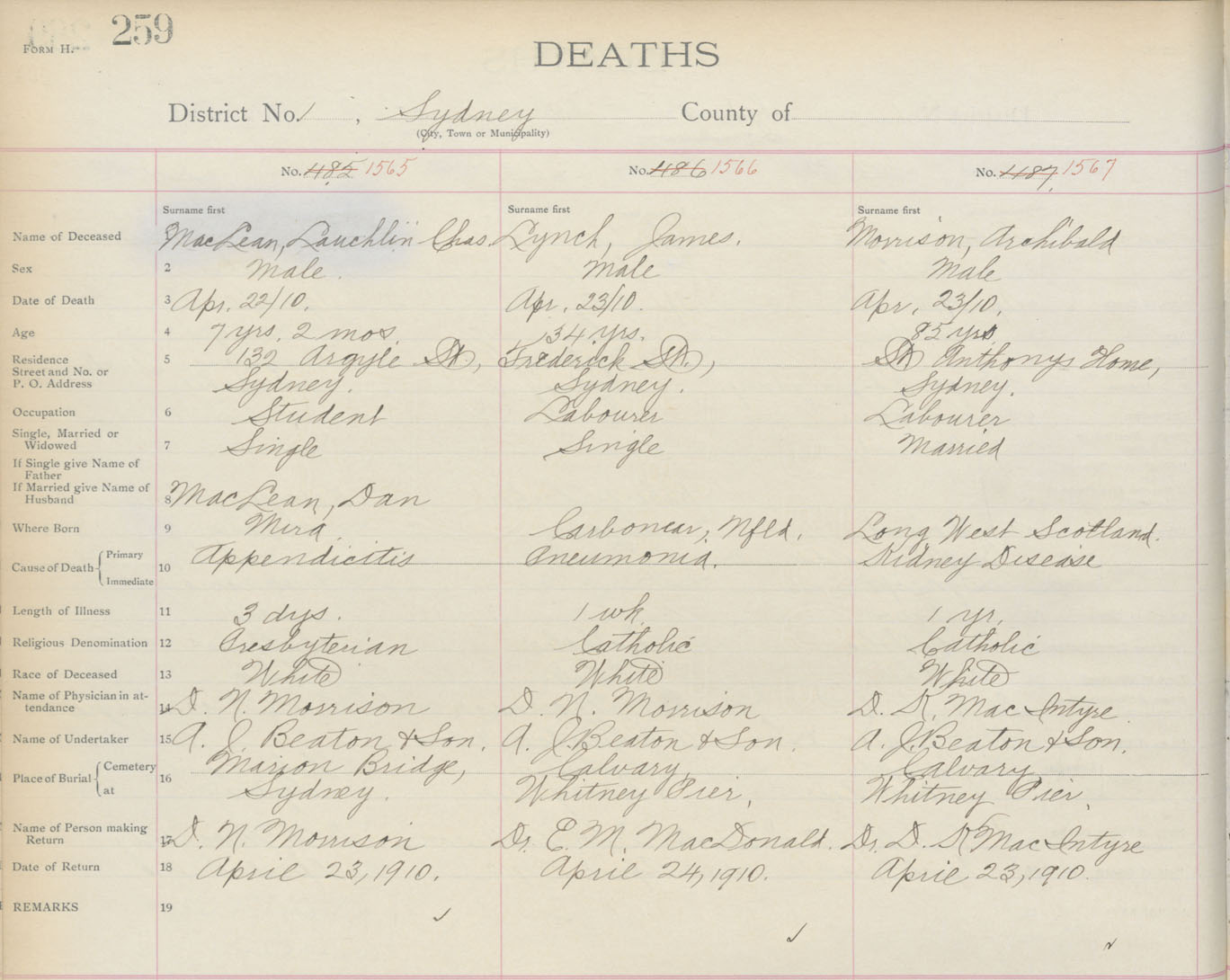 Death Registration: Year: 1910 book: 3 page: 259 number: 1567