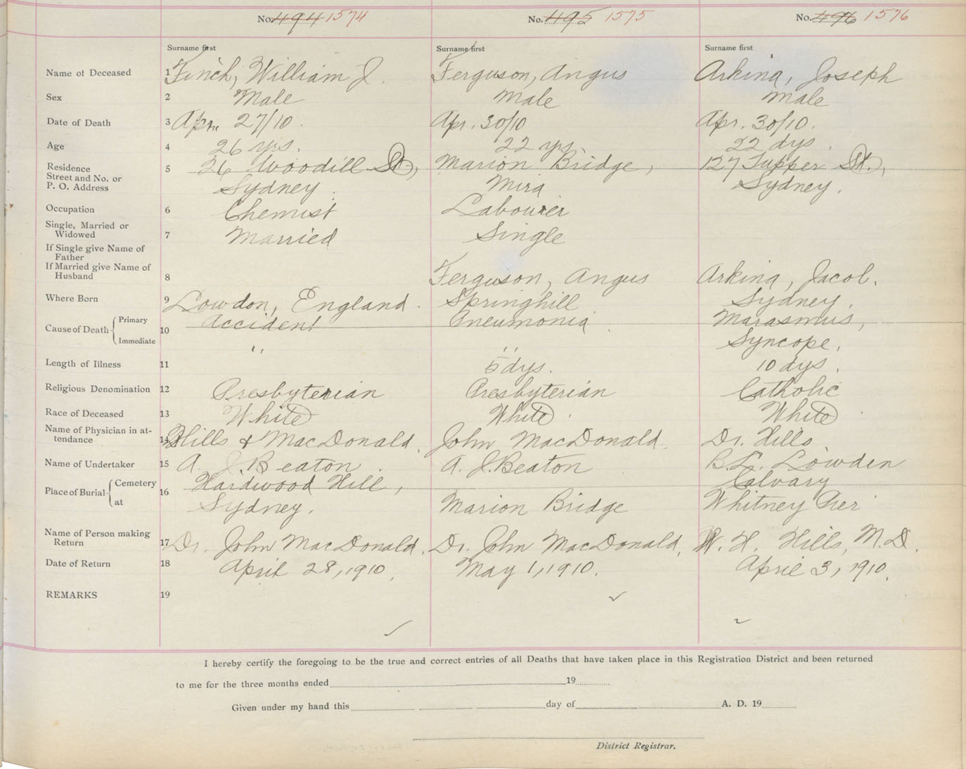 Death Registration: Year: 1910 book: 3 page: 260 number: 1574