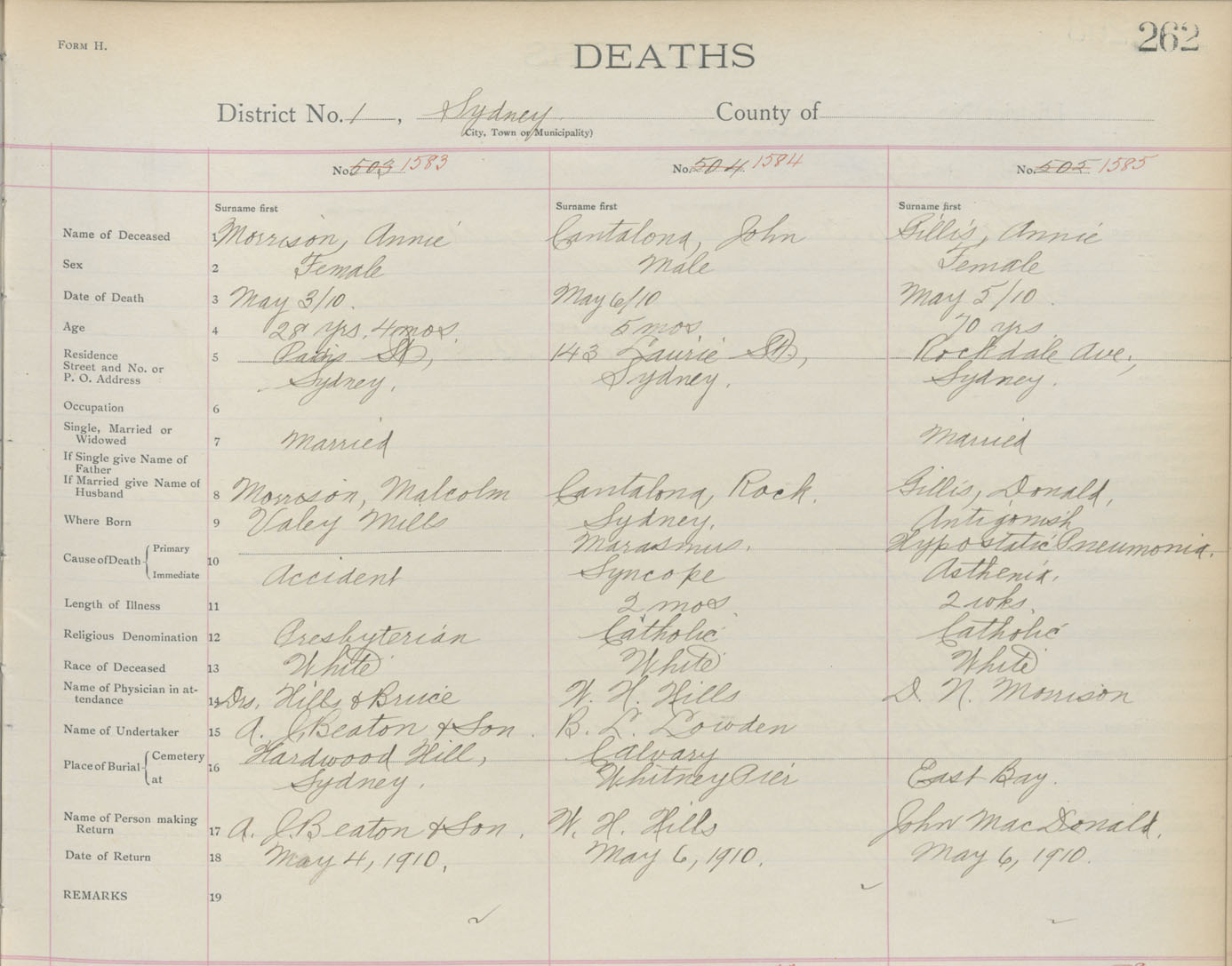 Death Registration: Year: 1910 book: 3 page: 262 number: 1585