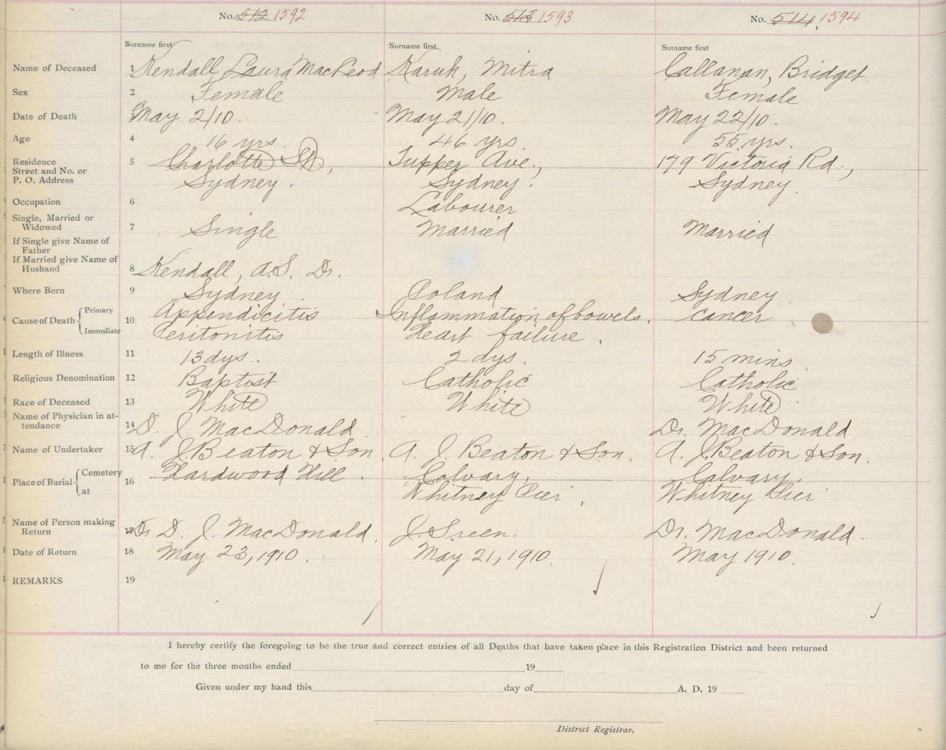 Death Registration: Year: 1910 book: 3 page: 263 number: 1594