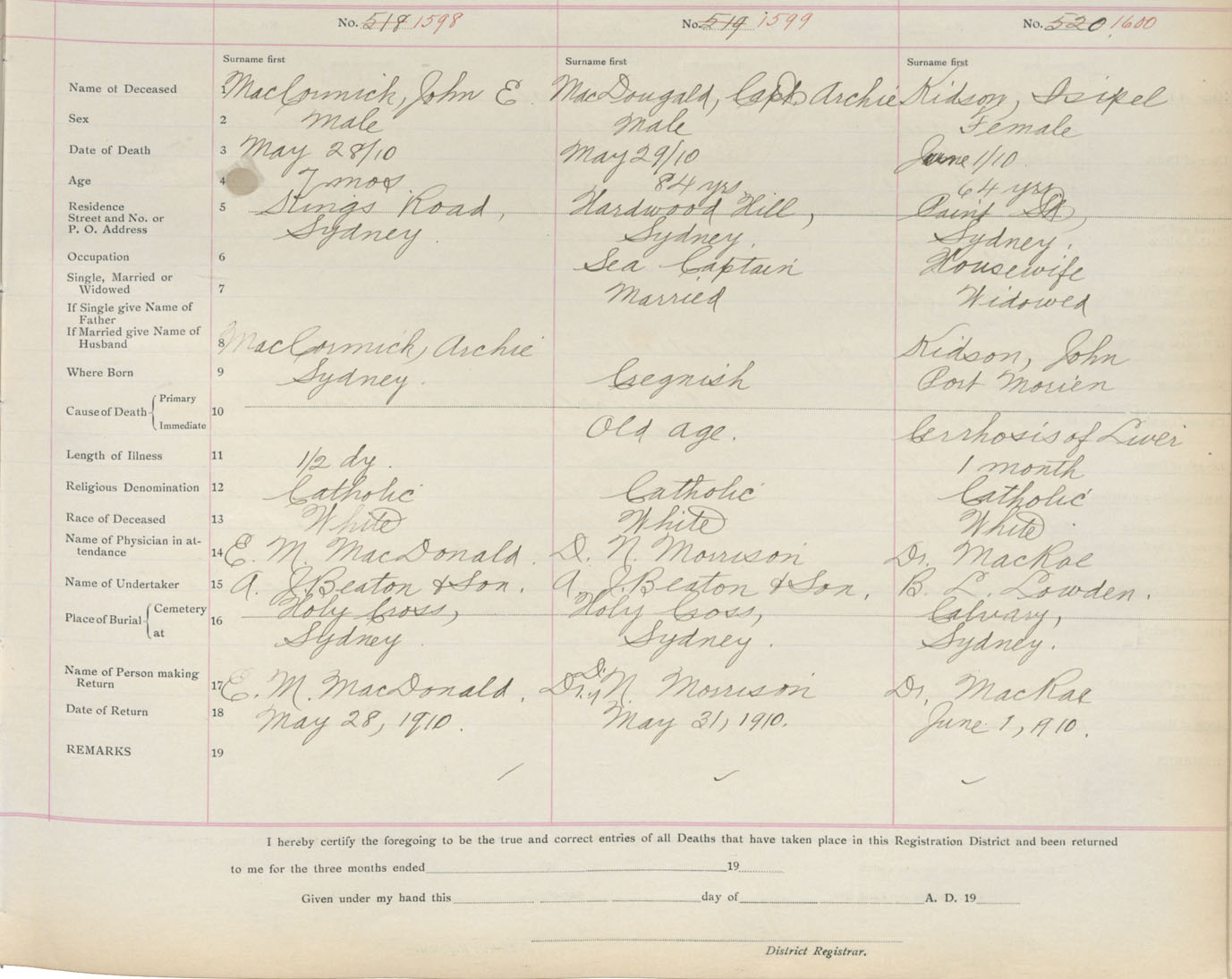 Death Registration: Year: 1910 book: 3 page: 264 number: 1598