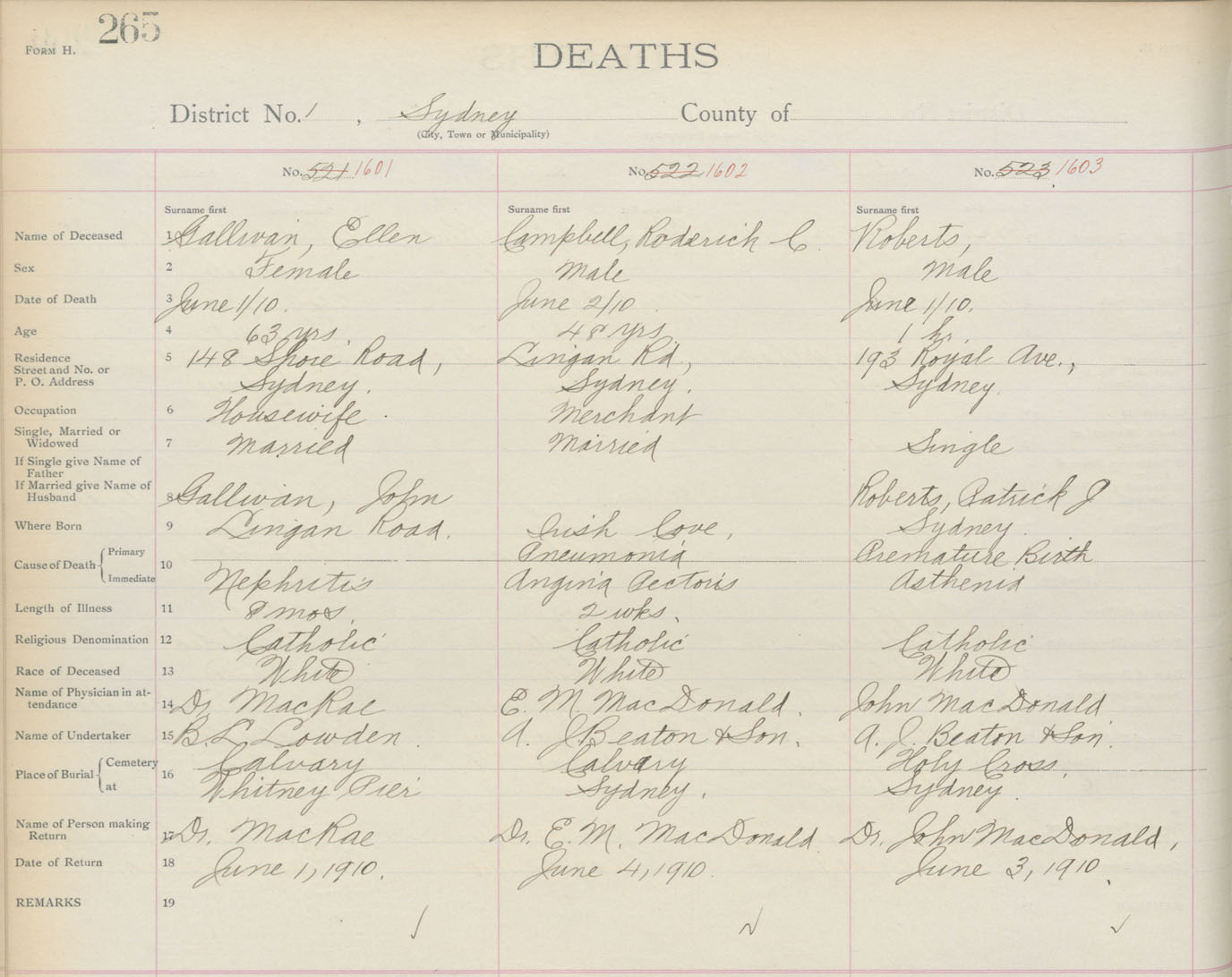 Death Registration: Year: 1910 book: 3 page: 265 number: 1601