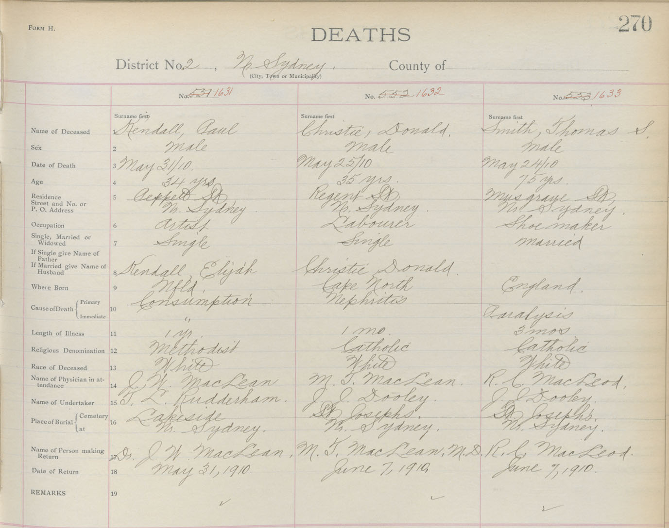 Male Death Registration: Year: 1910 book: 3 page: 270 number: 1631