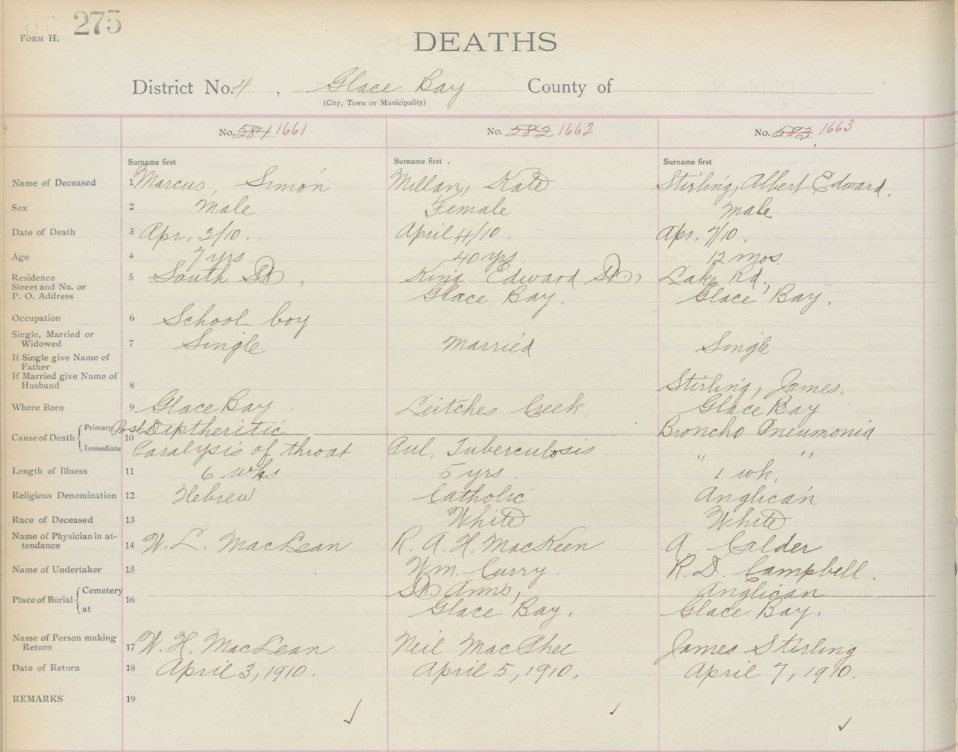 Death Registration: Year: 1910 book: 3 page: 275 number: 1663