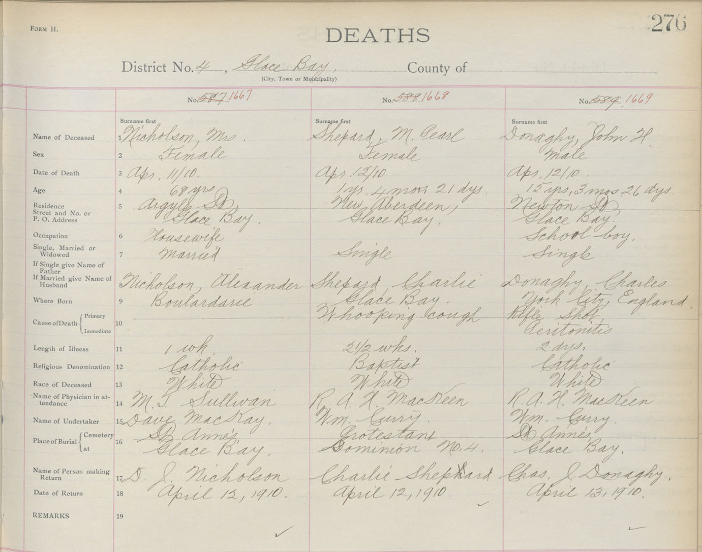 Death Registration: Year: 1910 book: 3 page: 276 number: 1667