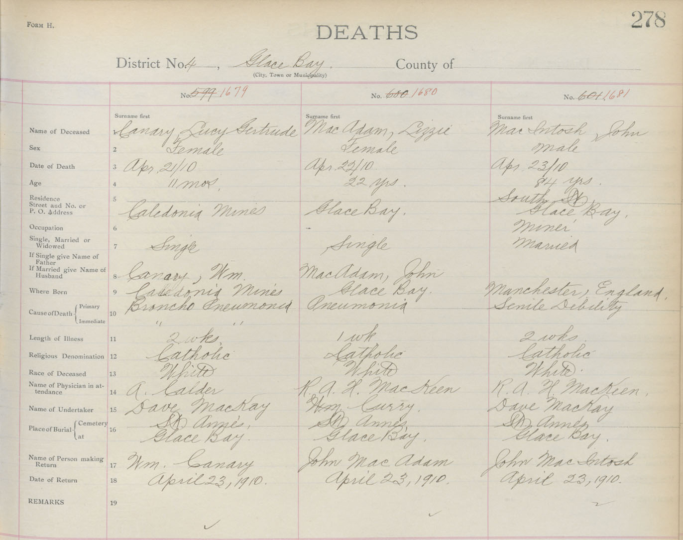 Death Registration: Year: 1910 book: 3 page: 278 number: 1681