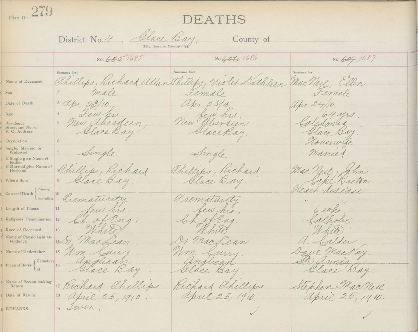 Death Registration: Year: 1910 book: 3 page: 279 number: 1685