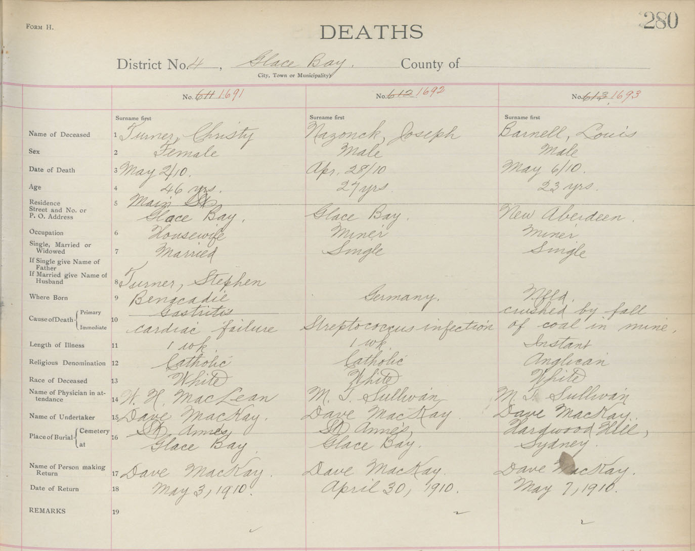 Death Registration: Year: 1910 book: 3 page: 280 number: 1691