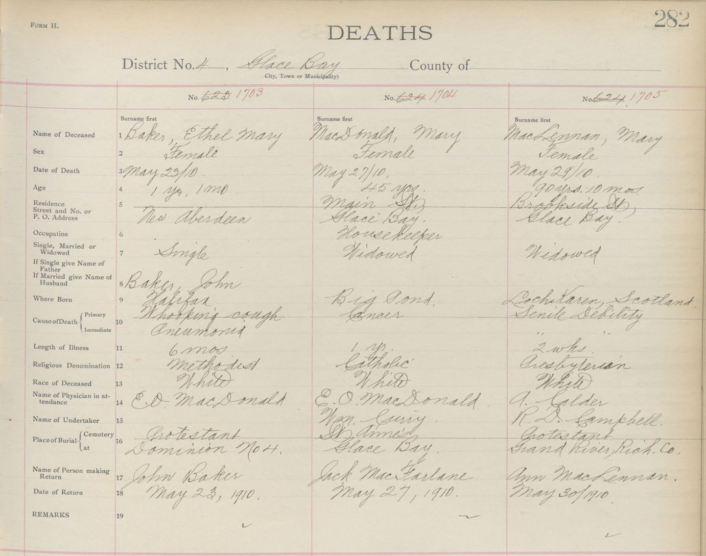 Death Registration: Year: 1910 book: 3 page: 282 number: 1704