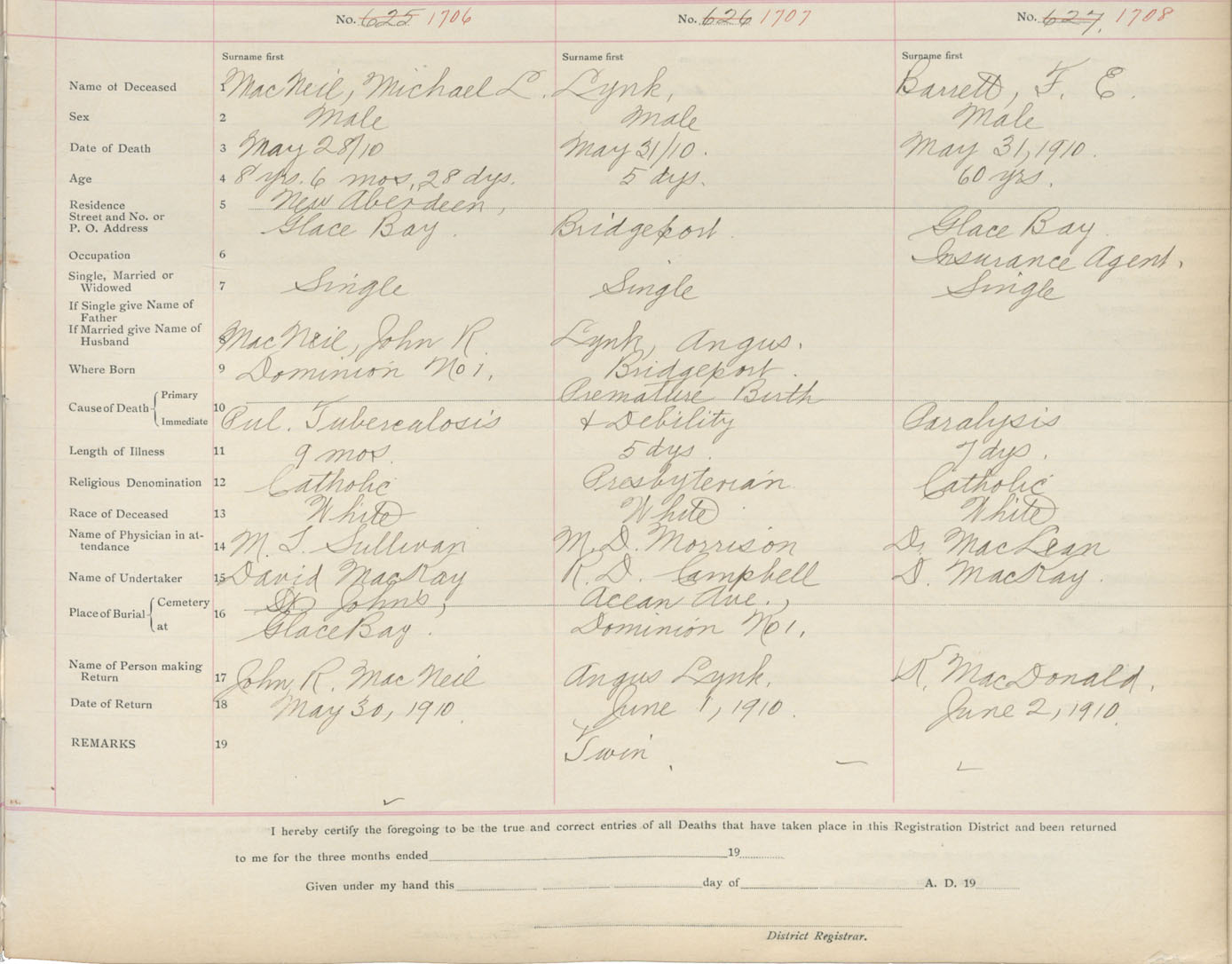 Death Registration: Year: 1910 book: 3 page: 282 number: 1706